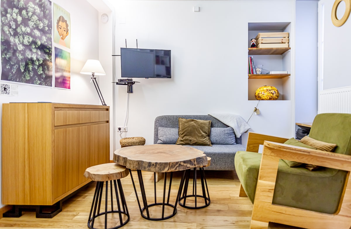 Glæsileg 66 m2 íbúð í miðborg Parísar, nýlega endurgerð til lúxus fullkomnunar! Þetta er 2ja herbergja íbúð miðsvæðis þar sem 9. og 10. hverfi mætast. - Fallegt, hátt til lofts með lúxus frágangi - Vinnustöð m/ standandi skrifborði, HRATT trefjar WIFi, skjár, lyklaborð, mús - Fullbúið eldhús (þ.m.t. Nespresso, NutriBullet, ofn, uppþvottavél o.s.frv.) - Samsung Frame TV (Netflix, Prime, YouTube, 200+ rásir) - Luxe marmarabaðherbergi
