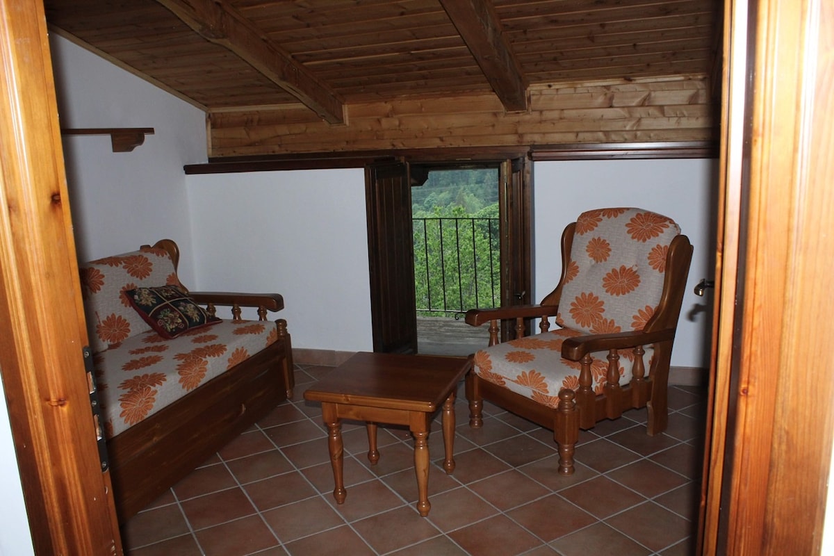 Casa indipendente in pietra, arredata con oggetti della tradizione locale e ricordi di famiglia. Gli spazi sono organizzati su due piani: sotto la sala da pranzo, il bagno di servizio, la cucina ed il salotto con il caminetto; al piano ammezzato la piccola biblioteca con due comode poltrone; infine sopra il bagno con la doccia, la camera matrimoniale, la camera con i letti a castello e infine la camera con i letti singoli. Il punto forte della casa è il grande giardino che guarda le montagne.
