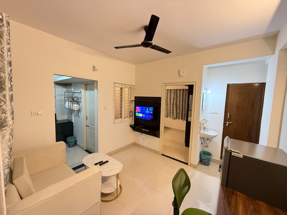 Verið velkomin í stúdíó Bren, heimili að heiman. Við vonum að þú njótir yndislegrar og þægilegrar dvalar í þessari flottu en sjarmerandi íbúð. Íbúðin er staðsett í öruggu samfélagi. Við höfum útbúið húsið með öllum nauðsynlegum þægindum til hægðarauka og þæginda. Þessi glænýi glæsilegi dvalarstaður er með fallegu svefnherbergi, aðliggjandi baðherbergi, fullbúnu eldhúsi, gestabaðherbergi og vinnu-/rannsóknaraðstöðu. Fullkomið fyrir heimsókn þína til Bangalore! Ég vona að þú njótir sérsniðinnar listar eftir listamenn á staðnum sem prýða veggina.