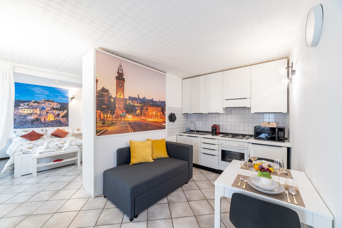 Yndislegt stúdíó staðsett í sögulega miðbænum. Þessi heillandi eign er tilvalin fyrir ferðamenn eða starfsfólk sem leitar að þægilegum og notalegum gististað. Íbúðin er með þægilegu hjónarúmi, svefnsófa, fullbúnu eldhúsi og fullbúnu baðherbergi. Íbúðin er í göngufæri frá stöðinni og bestu veitingastöðum, kaffihúsum og verslunum í neðri Bergamo, sem gerir hana tilvalinn stað til að skoða bæði sögulega miðbæinn og efri borgina.