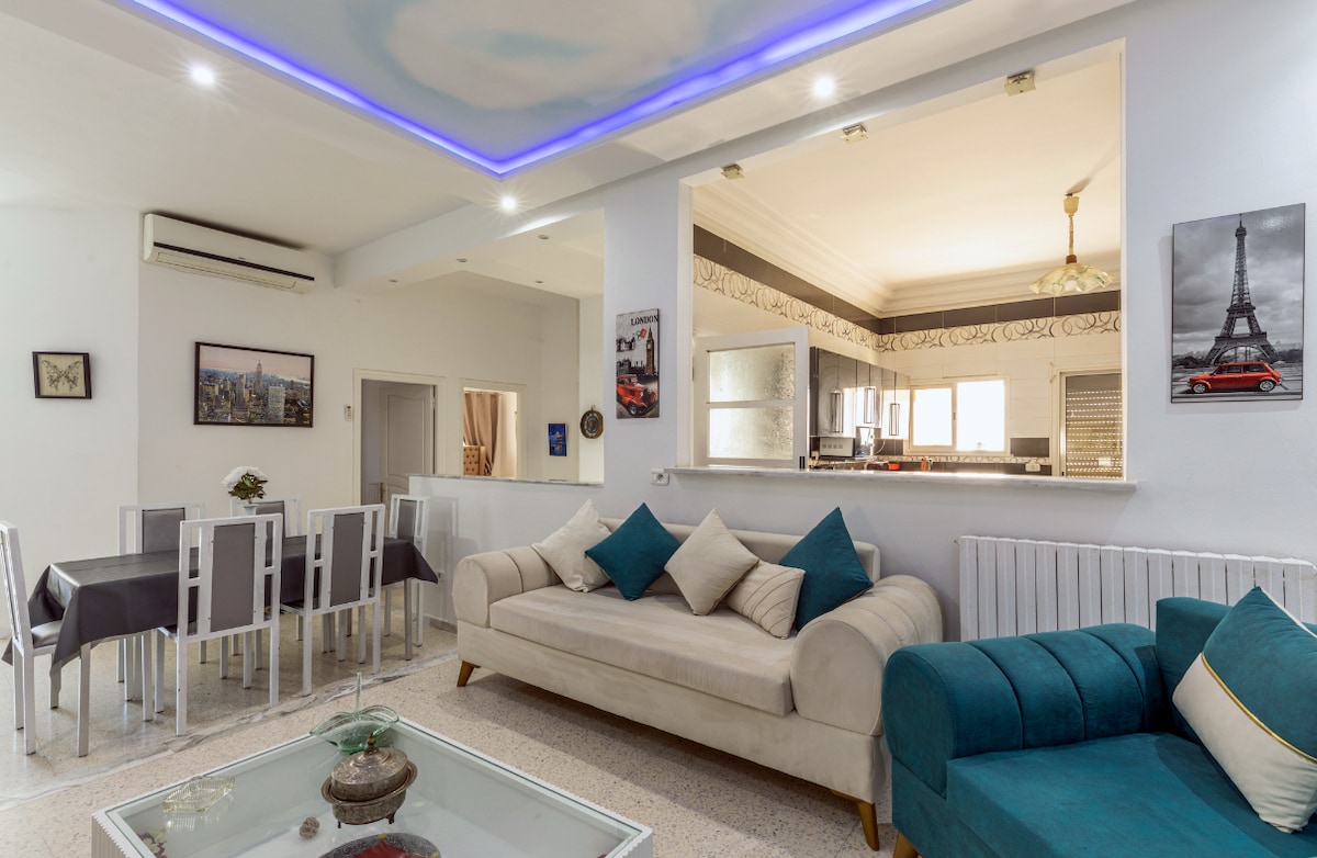*EITT svefnherbergi 🛌 með king-rúmi, vinnusvæði fyrir fartölvu og fataherbergi * EITT baðherbergi 🛁 með baðkeri, kertum, fljótandi sápu, salernisrúllu og hreinum handklæðum * Fullbúið eldhús með nauðsynjum fyrir morgunverð🍳, heimagerðum túnískum 🇹🇳 kryddum til að útbúa gómsætan mat 🥘 * Eldhúsið er að opna í rúmgóðri stofu með L-laga sófa þar sem þú getur notið þess að horfa á eftirlætis kvikmyndirnar þínar 🎥 * Stór svalir þar sem þú getur fengið þér síðdegiste 🍵 með útsýni ( þvottavélin 🧺 er í krökkunum)