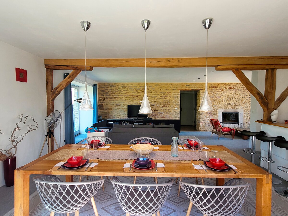 Í hjarta blómlegs og fagur þorps er steinhúsið okkar í Búrgúnd. Það er notalegt og notalegt. Við getum tekið á móti 4 manns (sjá 5 með millihæðinni) sem býður upp á ró og þægindi. Til að tryggja að ungir og gamlir eigi ánægjulega dvöl finnur þú barnarúm, leikföng, bækur, barnastól, borðrisa, pott, lange-mottu... Þú munt heillast af ljúfleika lífsins í sveitinni okkar.