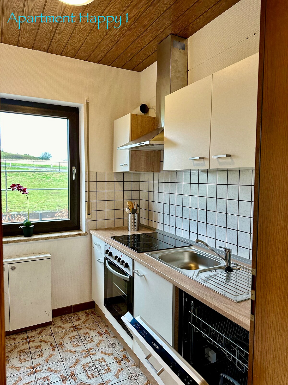 Die Ferienwohnung (75qm) erstreckt sich über zwei Etagen. Unten befindet sich das Wohnzimmer mit großer Fensterfront, Balkon und einem Schlafsofa für 2 Personen. TV und WLAN sind vorhanden. Im Schlafzimmer befindet sich ein Doppelbett. Das Badezimmer verfügt über Dusche, Badewanne und Toilette. Die Wohnküche mit Balkon ist mit Backofen, Dunstabzug, Elektroherd, Kaffeemaschine, Geschirrspülbecken, Geschirrspülmaschine, Kühlschrank, Mikrowelle, Toaster und Wasserkocher ausgestattet.