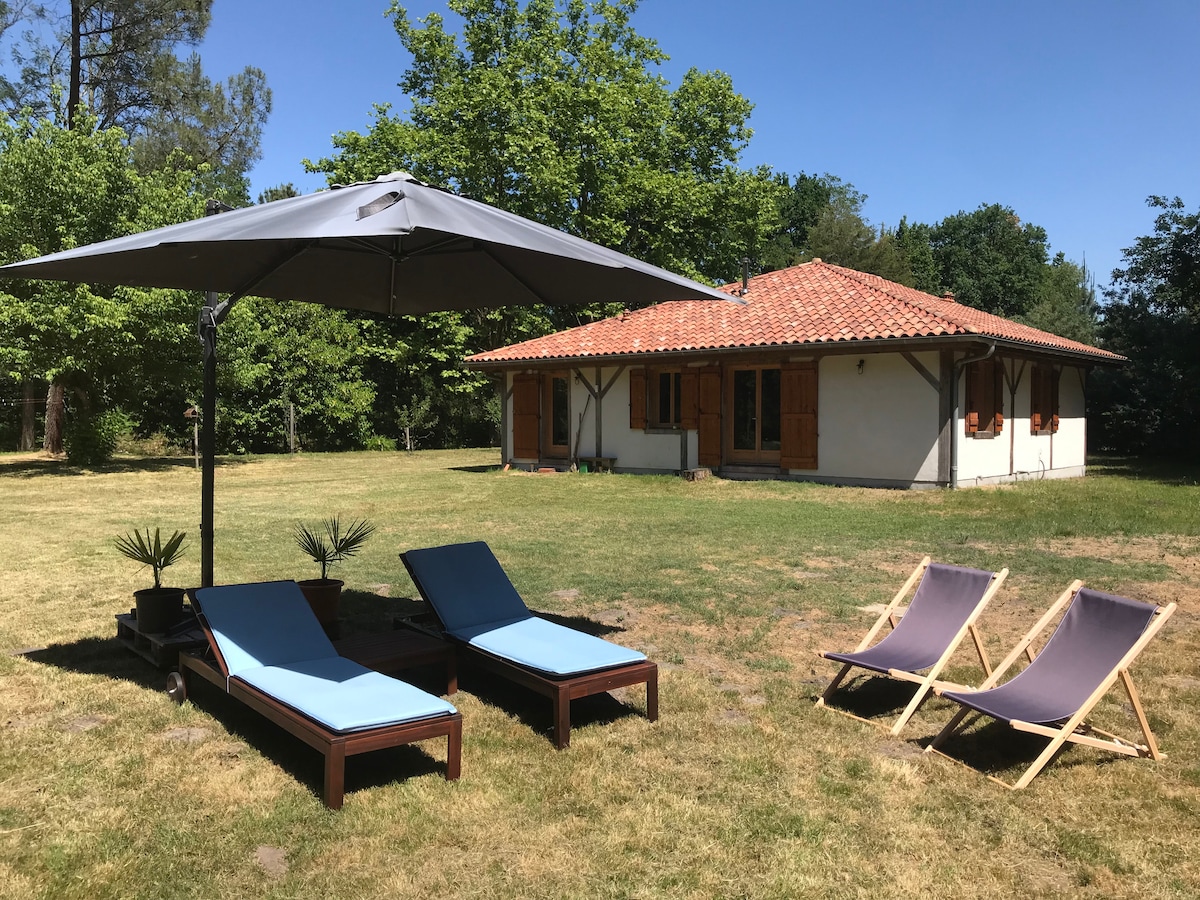 Aðskilinn bústaður - tilvalinn fyrir 2! - 600m² garður - Girt að fullu - hundavænt ! - Hljóðlega staðsett í „Forêt de Landes“, 11 km frá ströndinni. - stofa/svefnherbergi með svefnsófa og sjónvarpi - Fullbúið eldhús og stofa með arni - lítið baðherbergi. - Verönd fyrir framan húsið í morgunmat í morgunsólinni - Meadow with gazebo at the back of the house offers privacy for chilling - enough space also for your four-legged friends. (Fyrir aukafólk eru gestastólar!)