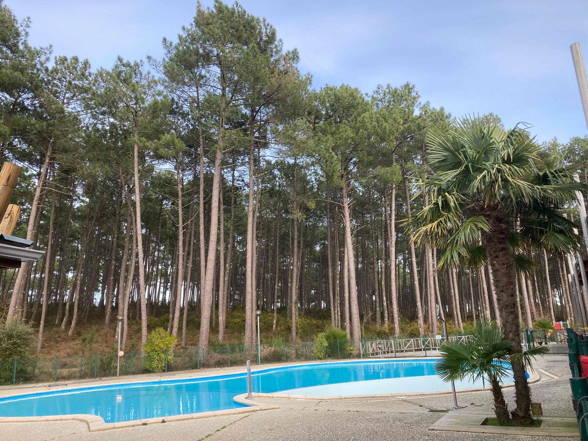 ⭐️ Meublé de tourisme classé ⭐️ Ce logement paisible offre un séjour détente et convivial pour tous ! Au cœur de la forêt de pins et à 4km de la plage, dans un village vacances proche Mimizan avec piscine extérieure, balnéo (piscine chauffée, sauna, hammam, jacuzzi), bar/restaurant, fitness, tennis, pétanque, ping-pong, location vélos, salon d'esthétique et de massages. A quelques minutes du village : BMX, city, accrobranche, tir à l'arc, mur d'escalade, paint ball, taureau piscine, mini golf…