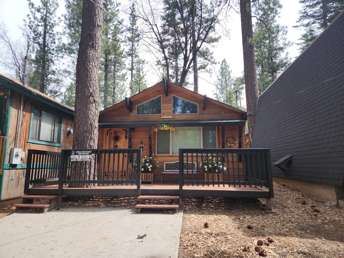 Stökktu til fjalla í þessum stílhreina og nýuppgerða fjögurra manna kofa sem arkitekt hannaði með þægindi þín í huga. Njóttu ferska loftsins úr heita pottinum til einkanota. Inni: Eitt svefnherbergi: Með þægilegu queen-rúmi. Stofa: Slakaðu á í mjúkum svefnsófa sem hentar vel fyrir tvo gesti. Utanhúss: Heitur pottur til einkanota: Slakaðu á í hlýjunni og njóttu fjallsins. Staðsetning: Þægileg staðsetning nálægt Big Bear Lake og í seilingarfjarlægð frá skíðabrekkunum með beinni strætisvagnaþjónustu.