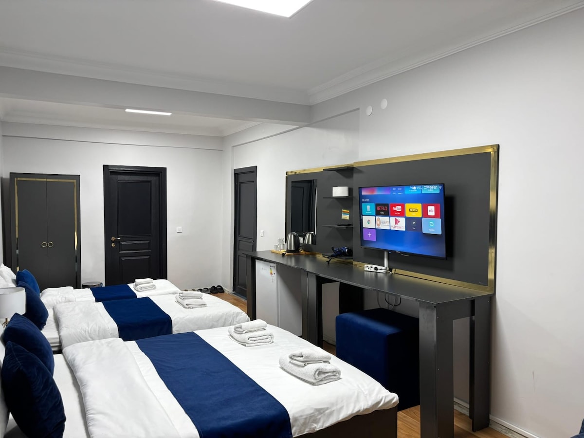Í 2+1 íbúðinni okkar er 1 hjónarúm og 2 einbreið rúm í miðjunni. Rúmar allt að 4 manns, 50 skjám Android box Netflix sjónvarp, PlayStation4 leikjatölva með tveimur handleggjum og ókeypis bílastæði við götuna. Öryggismyndavélar eru fyrir utan bygginguna og við inngang byggingarinnar. Það er í göngufæri við alla áfangastaði og mjög nálægt samgöngum,matvöruverslunum o.s.frv. Íbúðin okkar, sem er með badger-te í 50 metra fjarlægð, er rúmgóð, stílhrein, hrein og með öllum nauðsynlegum búnaði.