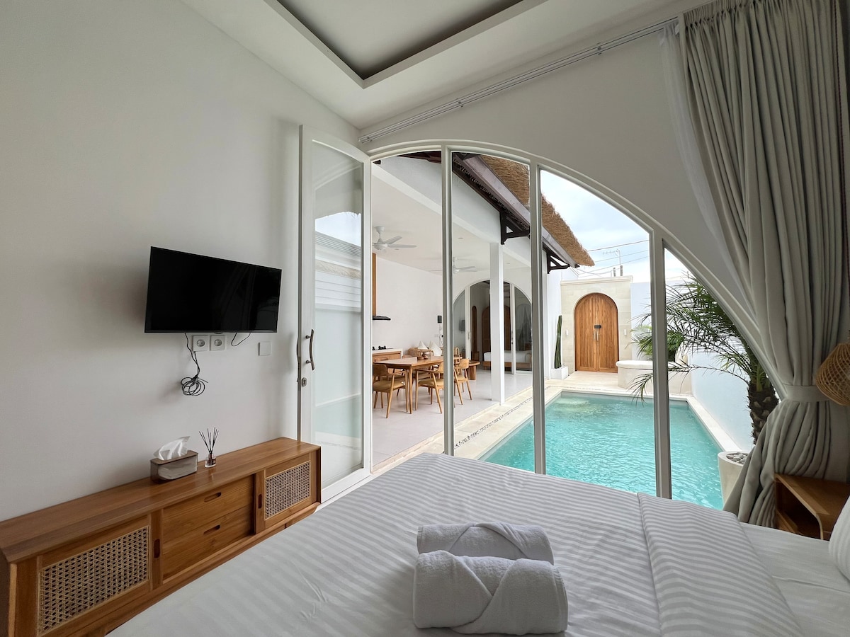 Villa Laut Impian - Yolla 2006 - Þessi 2ja svefnherbergja villa í Miðjarðarhafsstíl í Bingin blandar saman glæsileika við ströndina og þægindi. Það býður upp á afslappaða strandstemningu með hvítþvegnum veggjum, sveitalegum viðarbjálkum og náttúrusteini. Loftgóða stofan opnast að einkasundlaug og gróskumiklum garði sem er fullkominn fyrir afslöppun. Í hverju svefnherbergi eru innréttingar sem eru innblásnar af Miðjarðarhafinu og en-suite baðherbergi. Í göngufæri frá Bingin-ströndinni er tilvalið að fara í friðsælt frí nálægt brimbrettastöðum og kaffihúsum Balí.