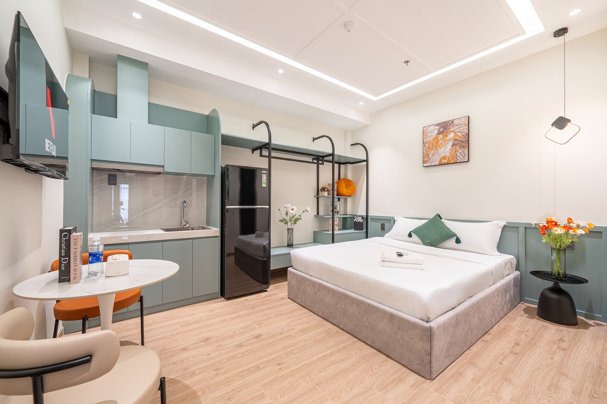 Deluxe Room with Kitchen | AMANA Hotel & Residence – Võ Thị Sáu Ấm cúng như ở nhà, tiện nghi như resort. Căn phòng đầy đủ tiện nghi, ấm áp, nổi bật với gam màu cam đất – nâu ấm nhẹ nhàng, kết hợp nội thất gỗ và họa tiết cổ điển. Không gian bếp nhỏ gọn, bàn làm việc, TV, máy nước nóng và ánh đèn vàng dịu mang đến cảm giác thư giãn, thân thuộc. Lựa chọn lý tưởng cho kỳ nghỉ dài ngày hoặc chuyến công tác cần sự thoải mái như ở nhà.
