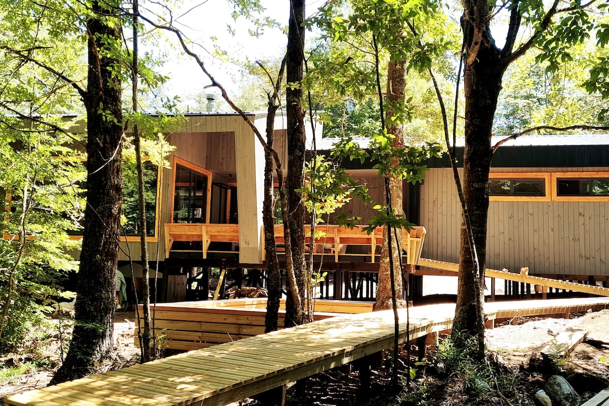 Chalet de montaña de lujo. de arquitectura patagónica andina de maderas nobles en medio de 3 has de bosque nativo y a orillas del rio Bio Bio con playa de pasto para tomar sol y pradera. Es posible pescar desde la orilla de la playa y salir de pesca vadeando el rio. El Chalet se encuentra en medio de un bosque de robles a solo metros del rio Cuenta con capacidad para 5 personas. Amplia terraza techada y tina caliente. Luz eléctrica, estacionamiento y wifi satelital. Completamente equipado.