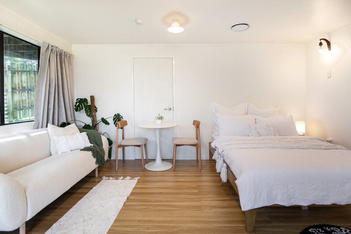 Just 15 minutes to the CBD and beautiful beach walks in the street, this location is ideal for your Auckland stay. With a modern bathroom and fully equipped kitchenette (note - no stovetop) you will have the flexibility to eat out or in while enjoying our peaceful back yard views and the king-size bed. We offer fast fibre WIFI as well as a selection of breakfast cereals and off-street parking. Lock-box check-in means you will have complete privacy to come and go when it suits.