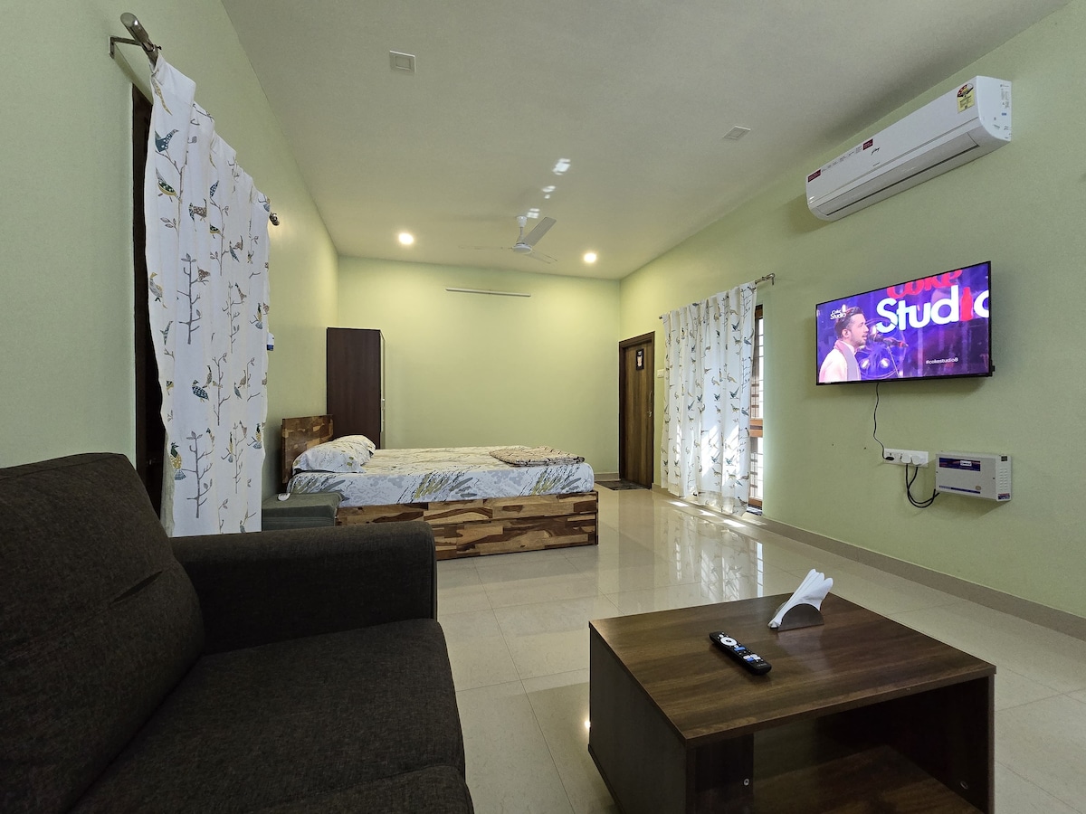 Cozy 1BHK Suite – Perfect for Peace & Comfort! Enjoy a peaceful retreat in charming 1BHK suite. The suite offers: 2 comfy double beds for restful sleep A spacious sofa for 6-8 people to relax and chat A fully-equipped kitchen with utensils, microwave, fridge, and more A refreshing bathroom with geyser & shower Safe parking for your vehicle Ideal for solo stays or up to 5, this space ensures comfort and relaxation throughout your stay. We provide Car/bike/activa on rent!