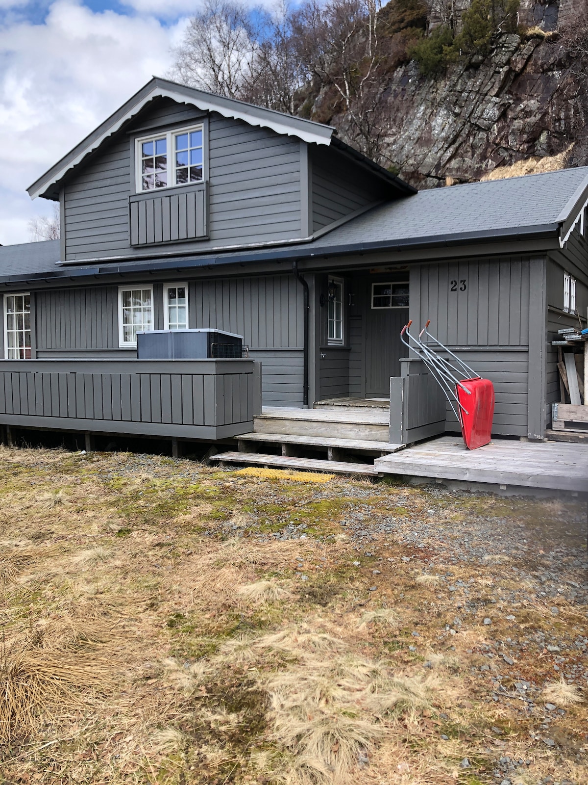 Hus med tre etasjer. To soverom oppe og et i innredet kjeller. Det er bad i første etasje og i kjelleren. Kjøkken og stue i ett, med nydelig utsikt og to verandaer. Huset ligger i et meget fredelig område på gården vår, i enden av en vei. Her kan du senke skuldrene og la tiden stå stille. Det er fint turterreng like utenfor døren. Du kan gå på stier i marka, eller ta bilen til populære destinasjoner i området som Preikestolen, Kjerag, Jærstrendene, Kongeparken, Sandnes og Stavanger.