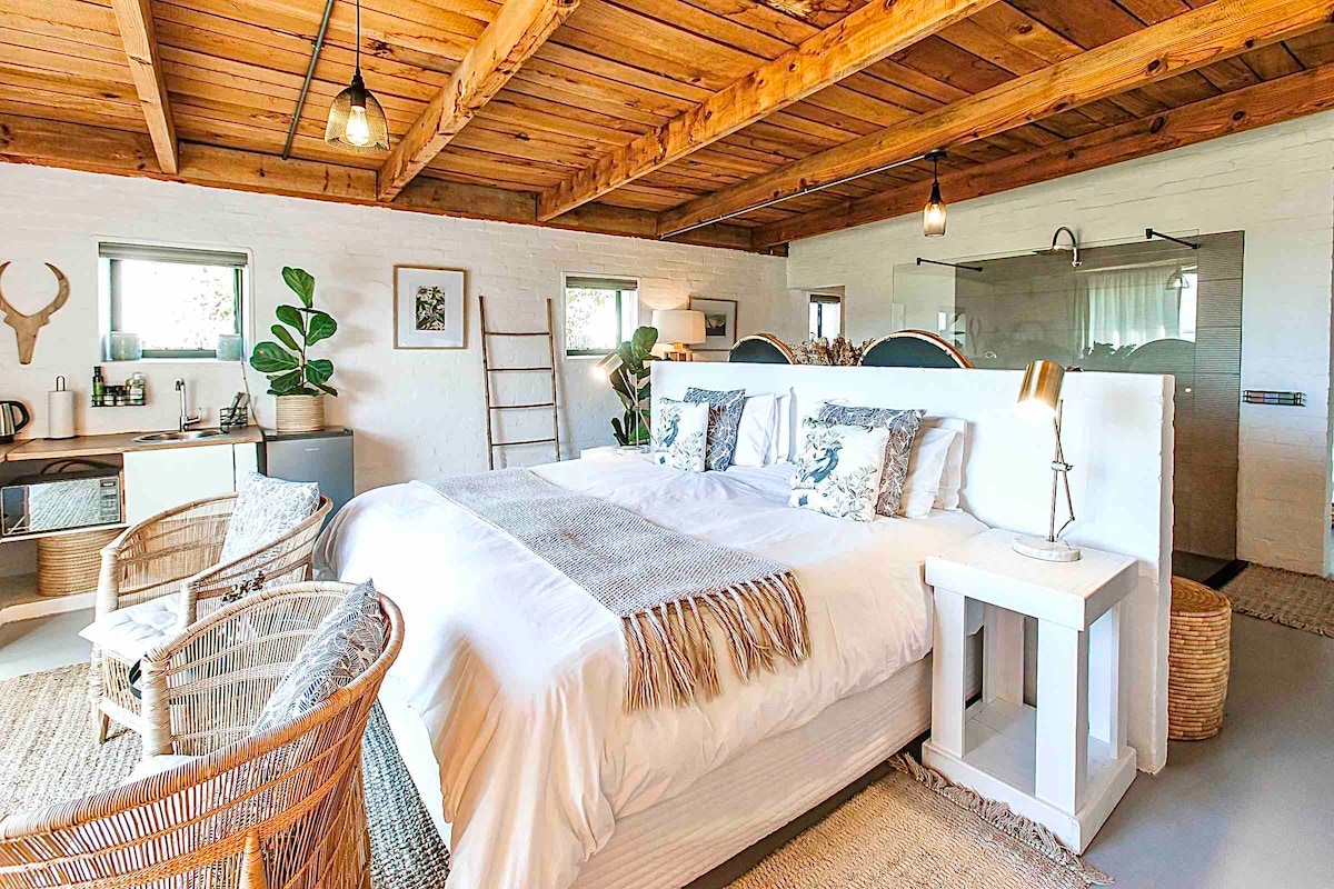 Fyrrum listastúdíói hefur verið breytt í fallegt lítið heimili sem er tengt aðalbyggingunni með útsýni yfir dalinn frá rúmi þínu og garði. Lengra upp í Kronenzicht-fjalli í friðsælu cul-de-saq getur þú slappað af á meðan þú dýfir þér í heitan pott út af fyrir þig, slappað af undir regnsturtu með stórfenglegu útsýni bak við fjallið og litlu ljónin eða hafið gönguferð í sólsetrinu á fallegum sandöldunum við hliðina á eigninni okkar, meira að segja alla leið niður að Sandy Bay.