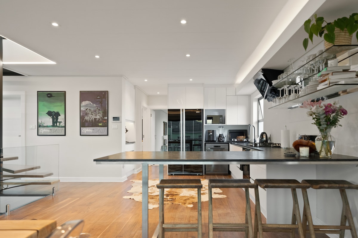 Einstök, víðáttumikil villa í Höfðaborg sem býður upp á útsýni yfir Green Point commons og hinn táknræna Höfðaborgarleikvang í bakgrunni Atlantshafsins og Robben Island. Fullkomlega staðsett í Green Point, við Atlantic Seaboard í einni af fágætustu og öruggustu götum CT innan nokkurra mínútna frá miðborginni, öllum matvöruverslunum, V&A Waterfront, flestum ferðamannastöðum og CT þægindum, ströndum og göngustígum.