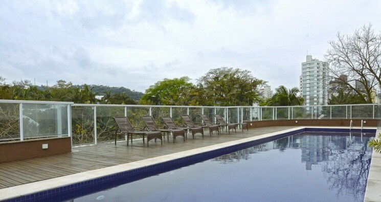 1-svefnherbergis íbúð 500 metra frá Vila Germânica/Vila de Pascoa, þar sem Oktoberfest er haldið, búin loftkælingu í svefnherberginu, þráðlausu neti, fullbúnu eldhúsi með áhöldum, vatnshreinsitæki og rúmfötum. Fullbúið frístundasvæði fyrir gesti: Sundlaug, líkamsræktarstöð, gufubað og minnimarkaður í íbúðarbyggingunni. Það er sameiginlegt OMO-þvottahús. Rýmið rúmar 4 gesti á þægilegan hátt. 1 svefnherbergi með hjónarúmi + sófi sem snýr að hjónarúmi.