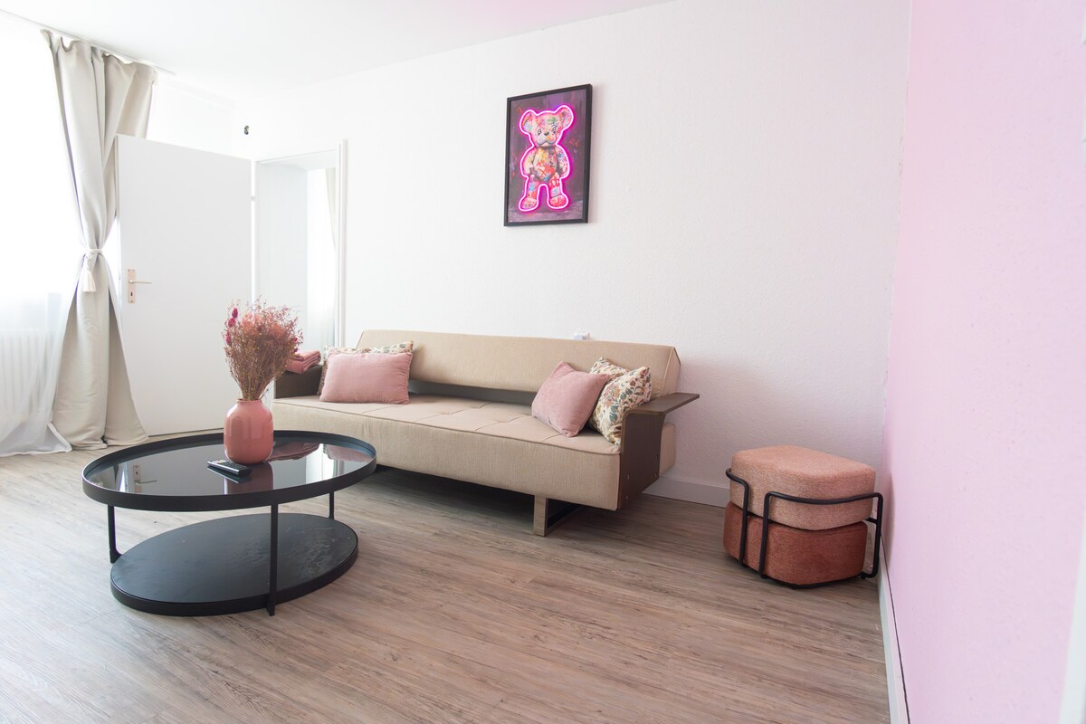 Nútímaleg, vinaleg og björt 65 m² loftíbúð á stað í miðbænum. Loftið skiptist í rúmgóða stofu sem samanstendur af notalegum sófa, sjónvarpssvæði, stóru herbergi með opnu eldhúsi og notalegu aðskildu svefnaðstöðu. Annar hápunktur er lúxusbaðherbergið. Hægt er að komast í miðborgina fótgangandi á innan við 1 mínútu. Þrátt fyrir miðlæga staðsetningu, mjög rólegt, þar á meðal útsýni yfir Kassel. Lestar-/rútutengingar beint fyrir utan dyrnar