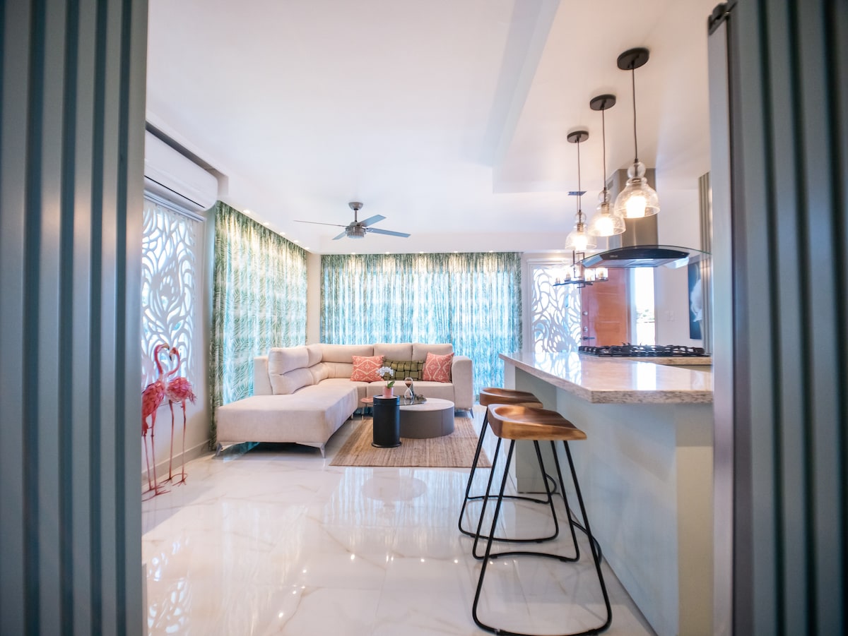 Glæný 2 svefnherbergja íbúð með öllum tækjum og húsgögnum fyrir heimili. Pláss fyrir allt að 4 gesti með 2 queen-size rúmum. Bílastæði í boði fyrir eitt ökutæki. Næg þægindi eins og almenningsgarðar, strönd, miðbær Bani, verslanir, næturklúbbar og fleira. Tveggja herbergja íbúð með öllu inniföldu. Eignin er fyrir 4 manns með tveimur svefnherbergjum með queen-size rúmi og lofti. Lokað bílastæði fyrir einn bíl. Svæði til að njóta eins og almenningsgarða, strönd, miðbæ Bani, verslanir, næturklúbbar og margt fleira.