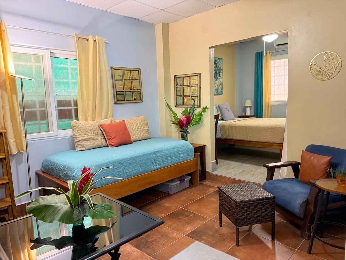 Endurtengstu ástvinum. Þetta endurnýjaða stúdíó í Bocas del Toro er tilvalið fyrir frí í Karíbahafinu fyrir tvo!! Hún var vandlega hönnuð til að bjóða þér upp á öll þægindi og lúxus með hágæðatækjum og hlýju viðarhúsgagna frá staðnum sem gefur rýminu nútímalegt og heillandi sveitalegt útlit. Það er staðsett miðsvæðis á aðaleyju Bocas del Toro eyjaklasans, Isla Colon, sem kemur þér fyrir í miðri athöfninni. Farðu í matvöruverslanir, veitingastaði og verslanir í innan við 2 eða 3 mínútna göngufjarlægð.