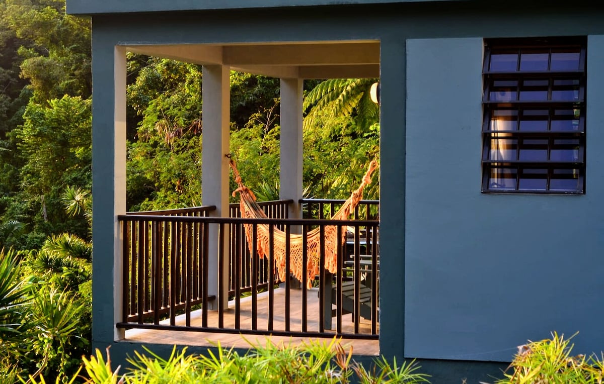Regnskógur með útsýni yfir grasafræðilega paradís og út að karabíska hafinu. Afskekkt afdrep með lífrænt ræktuðum afurðum og ilmkjarnaolíubrugghúsi. Upplifðu heillandi sól og tunglsetur, fjölbreytni fugla og blóma, lilly tjarnir og geitur. Sólarknúinn skála hefur þægindi af ensuite heitri sturtu og háhraða interneti. Það er eitt rúm í fullri stærð og eitt einbreitt rúm. Verandah er rúmgott með sólstólum og hengirúmi. Fullbúið eldhús og borðstofuskáli