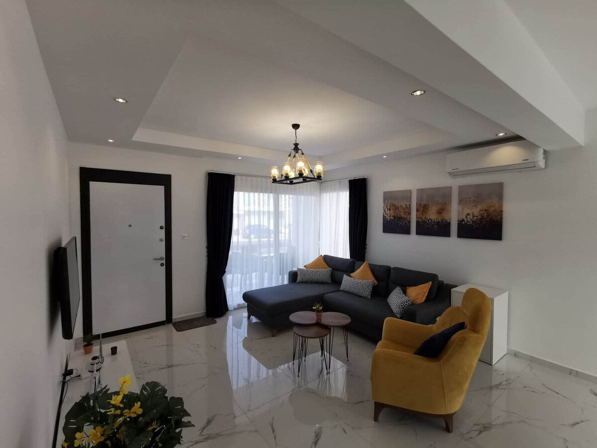 Að vakna í aðeins 350 metra fjarlægð frá hreinasta sjó Kýpur... Það eykur allt aðra ánægju fyrir fríið þitt. Þessi nútímalega og rúmgóða íbúð gerir þér kleift að njóta sjávarlyktarinnar á morgnana með nálægðinni við ströndina og njóta vatnsins allan daginn. Þetta er tilvalinn valkostur til að slaka á og skoða fegurð Kýpur með þægilegu rými og miðlægri staðsetningu.