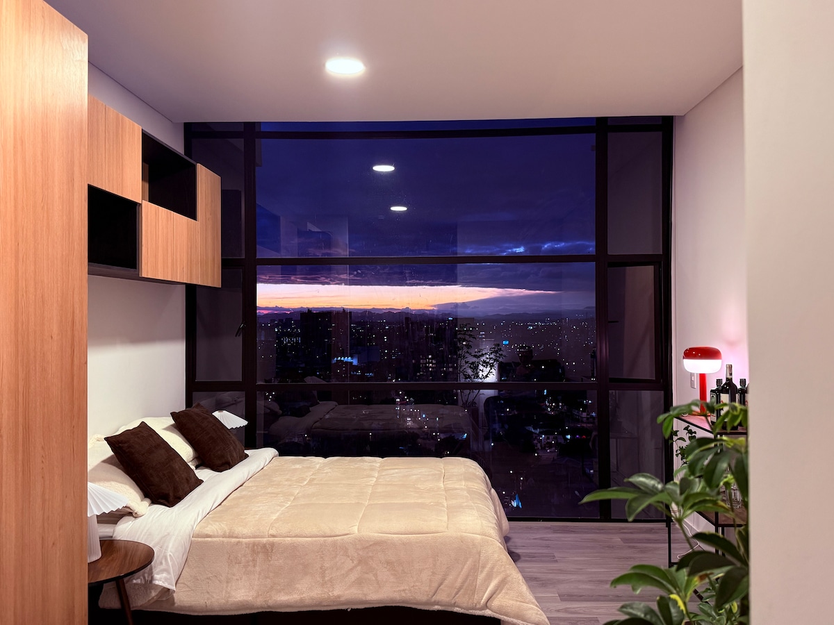 Tvíbýli á þakíbúð með tvöföldu lofti og víðáttumiklum gluggum í El Polo, norðan við Bogotá. Óhindrað útsýni yfir borgina frá báðum hæðum. Rúmar 4 gesti í 2 svefnherbergjum með queen-size rúmi og sjónvarpi. 2 baðherbergi, fullbúið eldhús, borðstofa, vinnuaðstaða og háhraða-þráðlaust net. Svalir með útsýni. 7 mínútna göngufjarlægð frá El Virrey-garðinum, 8 mínútna akstursfjarlægð frá Parque 93, 12 mínútna akstursfjarlægð frá Zona T, 25 mínútna akstursfjarlægð frá flugvellinum. Bygging með dyravörð allan sólarhringinn, sameiginlegu vinnusvæði og sameiginlegri verönd með 360° útsýni. Þvottur og bílastæði eru í boði gegn gjaldi.