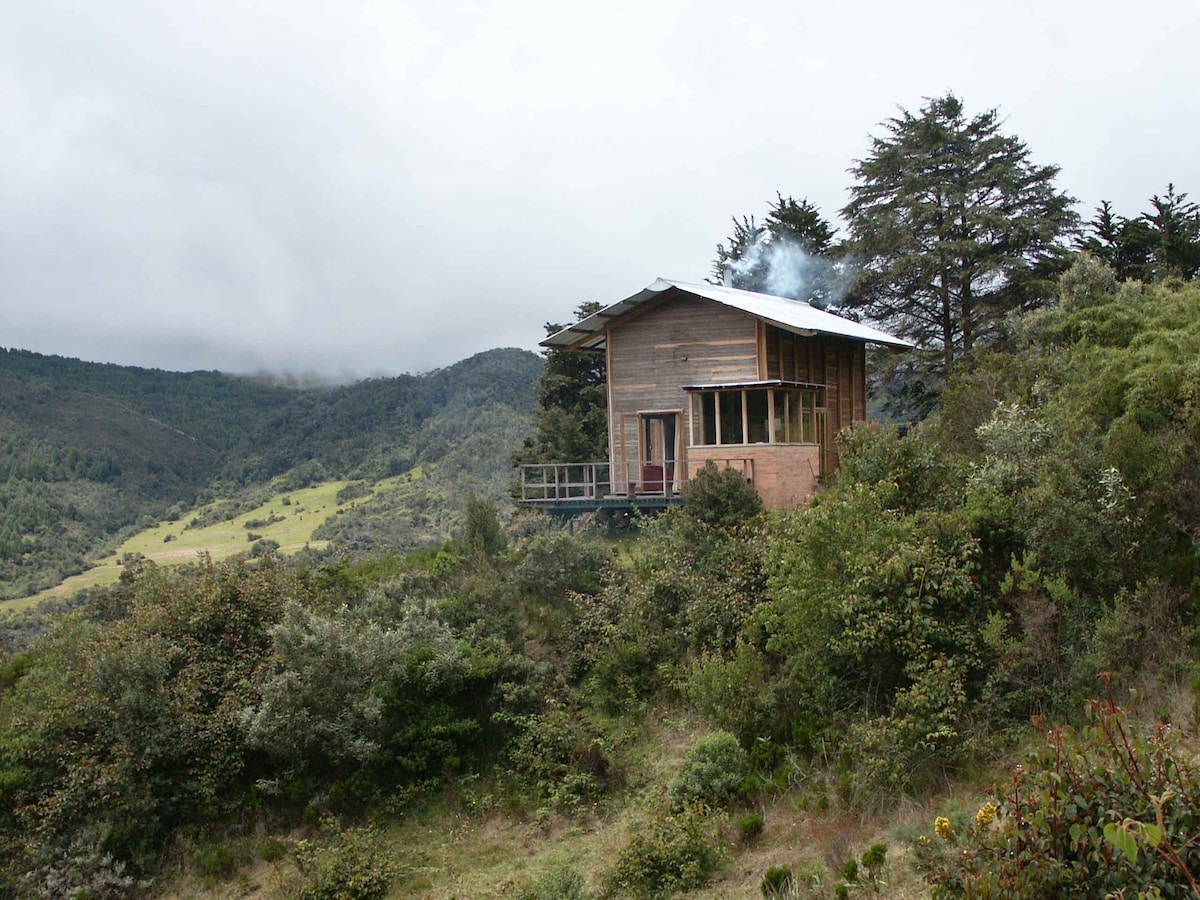 Njóttu þessa einstaka og friðsæla kofa fyrir ofan Bogotá-borg ef þú ert að leita að rólegum stað fjarri hávaðasamri borg, þetta er staðurinn. Uppgötvaðu upplifunina af því að búa á minimalískan hátt sem er frábær útivist til að slaka á og hlaða batteríin. staðsett í aðeins 20 mínútna fjarlægð frá Bogotá, Via La Calera og fyrir tollinn ; Nálægt stöðum með vistfræðilegum og hestaslóðum ásamt börum og veitingastöðum. Tilvalið fyrir pör sem vilja komast í frí frá borginni . Mundu því að taka með þér hlý föt