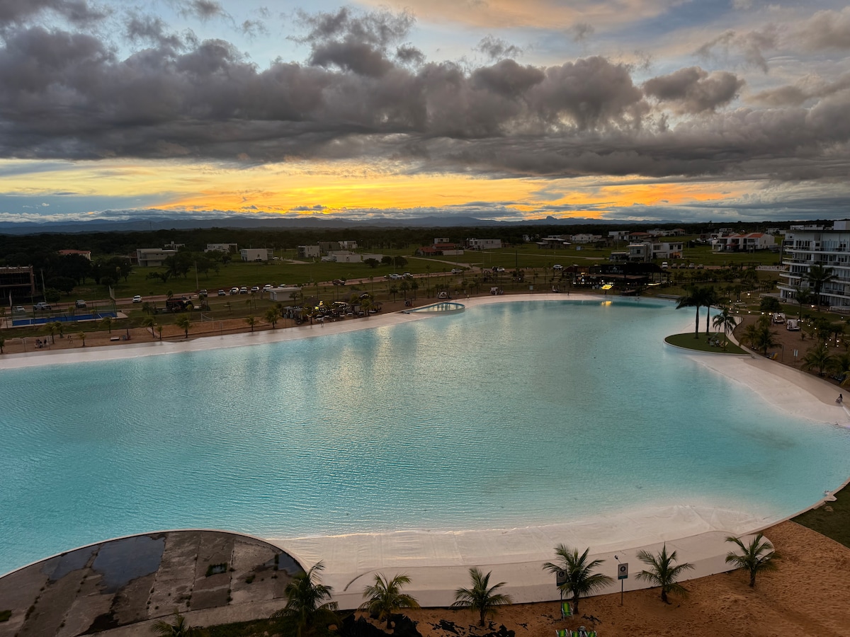 Njóttu glæsilegrar, ferskrar og hagnýtrar íbúðar sem er hönnuð til að veita þægilega og eftirminnilega dvöl. Stofan er samþætt stórum svölum sem horfa beint á kristaltæra lónið sem skapar fullkomið andrúmsloft til að slaka á, vinna eða deila kaffi í dögun. Svefnherbergið er með þægilegu rúmi með úrvalsrúmfötum. Eldhúsið er fullbúið til að láta þér líða eins og heima hjá þér. Nútímalegt baðherbergi með hótelblæ. Útsýnið er kjarninn í upplifuninni