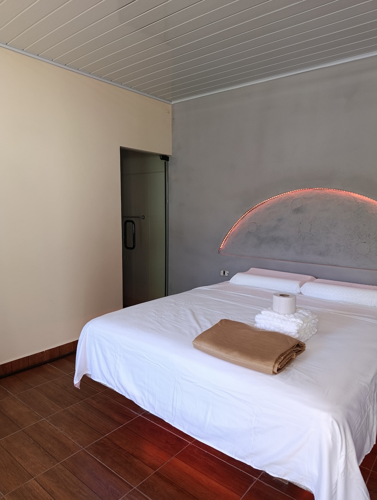 Executive þriggja manna herbergi. Staðsett á efstu hæð með útsýni yfir garðinn og aðgang frá aðalbyggingunni að galleríum. Í rúmgóðu herbergi með hjónarúmi og einbreiðu rúmi. Það er skreytt í stíl við íbúa cruceña svæðisins, þess vegna heitir það Camba. Búin: -Aire Conditioning -TV -WIFI -Frigobar - Hreinlætisvörur -Dagleg þrif -Desayuno innifalið Villa Chiquitana er fjölbreytt umhverfi afslöppunar og þæginda til að lifa kjarna Chiquitania.