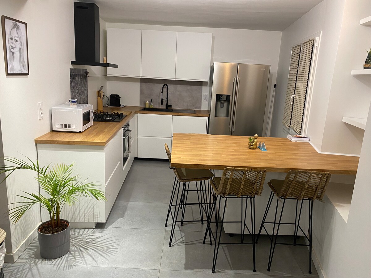 "La Maison aux Oliviers" er lítið heillandi bóndabýli 90 m2, loftkælt, sjálfstætt og staðsett á gömlum ólífulundi, rólegt í landslagshönnuðum garði sem býður upp á fallega einka upphitaða og örugga sundlaug. Breitt skyggni þess býður upp á tækifæri til að lifa úti í skjóli fyrir sól og vindi (mistral). Nálægt sögulegu miðju, staðbundnum markaði og verslunum (á fæti), það er fullkomlega útbúið fyrir fjarvinnu (háhraða trefjar)
