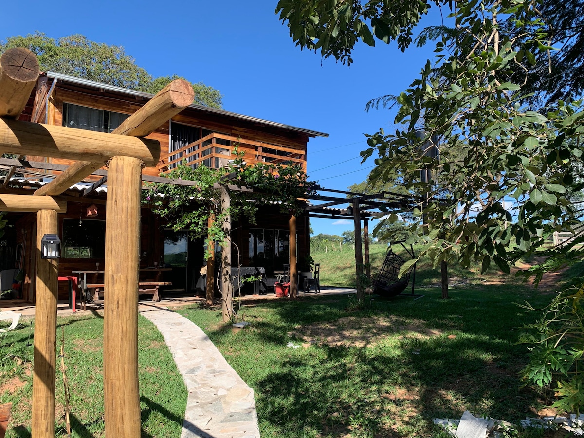 Um það bil 1000 m2 svæði, umkringt grænu. Slakaðu á í þessu rými í 15 mínútna fjarlægð frá Goiânia , auðvelt aðgengi, þú færð næði, kyrrð í miðri náttúrunni og mikið af þægindum. Innihaldsefni sem gera Apoena skálann að einstakri upplifun nálægt höfuðborg Goiana, fyrir þá sem elska að flýja hávaðann og hafa þægindi arins (inni og úti), hágæða þráðlaust net (starlink), baðker, heilsulind og skjávarpa til að sjá kvikmyndir sínar og þáttaraðir með stæl.