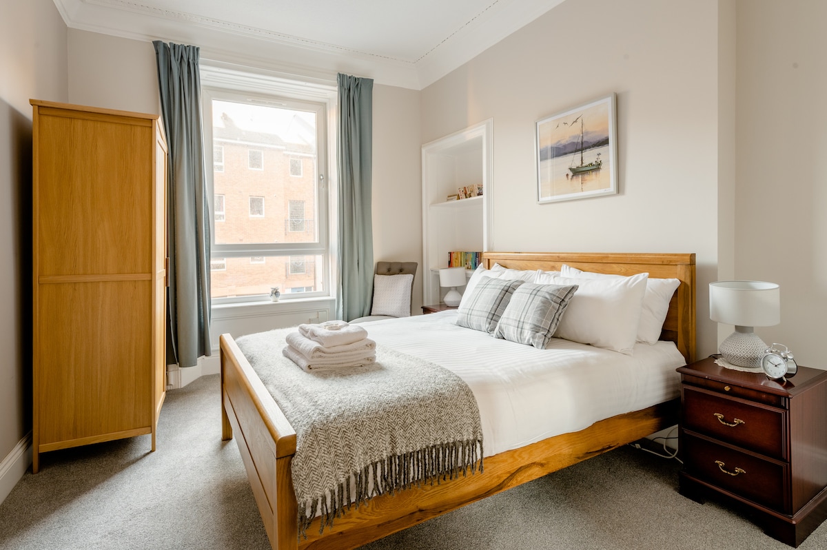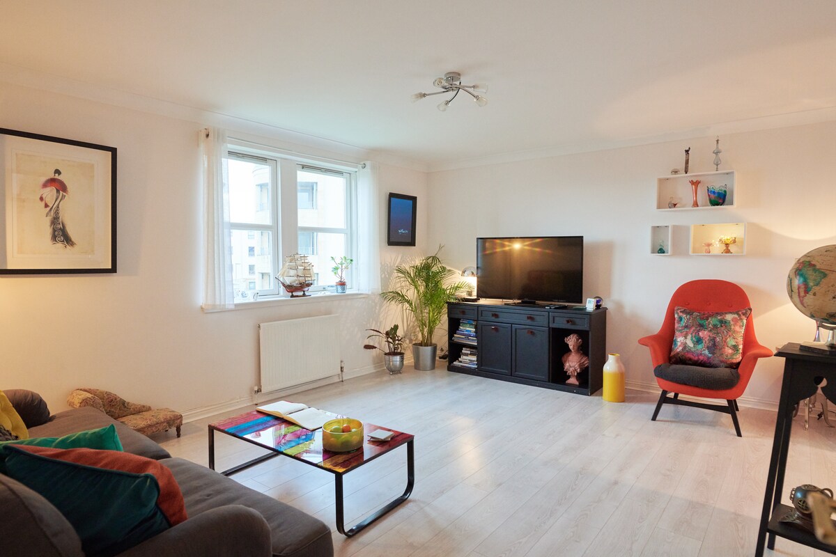Verið velkomin í björtu og rúmgóðu íbúðina okkar sem er notalegt athvarf í hjarta Leith's Shore-svæðisins. Njóttu afslappaða andrúmsloftsins þegar þú skoðar fjölbreytt kaffihús, líflegar krár og veitingastaði. Með greiðan aðgang að miðborg Edinborgar og beinan sporvagnatenging við flugvöllinn er allt í góðu sambandi og það er aldrei skortur á dægrastyttingu og kennileitum til að sjá. Njóttu ókeypis bílastæða um helgar. Með stuttri gönguferð á virkum dögum. Tilvalið fyrir allt að tvo gesti, slappaðu af og láttu eins og heima hjá þér. Við hlökkum til að taka á móti þér! 😊