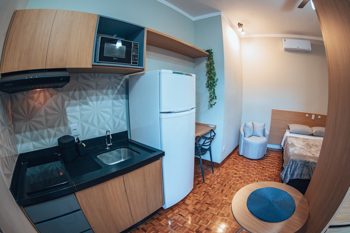 *** Aðeins verður boðið upp á einbreitt rúmföt í bókunum með þremur gestum og aðeins fyrir sófann fyrir bókanir með 4 gestum. Nossa Studio er 60 m2 að stærð og nýtur forréttinda í Bauru. Það er staðsett nálægt Bauru Shopping, börum, veitingastöðum og nálægt Centrinho/Usp, CPO og FACOP. Þetta er nútímaleg og notaleg eign, full af stíl, þægindum og loftkælingu. Gestir munu geta notað matvöru og þvottaaðstöðu. Gestir mega ekki nota önnur sameiginleg rými.