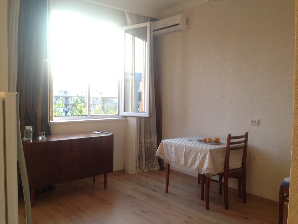 Entire bright and cozy studio in residential neighborhood in the very centre of the city surrounded with economy shops, banks, etc. It's several min walk to bus stop and Tsereteli Metro station (with the reach to whole city via public transport) and 10 min taxi drive from Old Tbilisi. Close to Main Train Station, Dinamo Arena, Aghmashenebeli Ave.