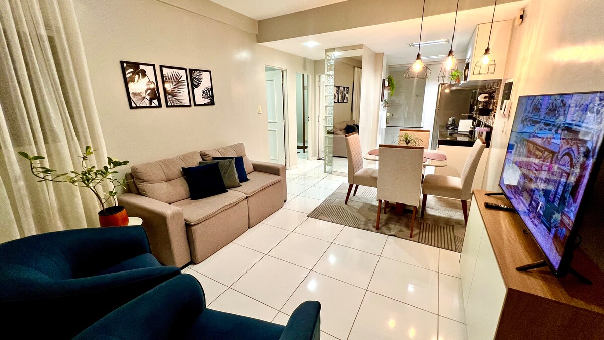 Apartamento com Ar-Conditionado, notalegt og vel staðsett: 8 mín frá Hangar, 15 mín frá flugvellinum og 20 mín frá miðbænum. Tilvalið fyrir pör, fjölskyldur eða alla sem ferðast vegna vinnu eða skoðunarferða. Hér eru 2 loftkæld svefnherbergi, þægileg stofa með snjallsjónvarpi, þráðlaust net, ísvatnssía, vel búið eldhús, borðstofuborð, baðherbergi og laust bílskúrspláss. Það er á 2. hæð (aðgengi við stiga) í öruggri og hljóðlátri íbúð. Þín bíður þægindi, hagkvæmni og notalegt viðmót!