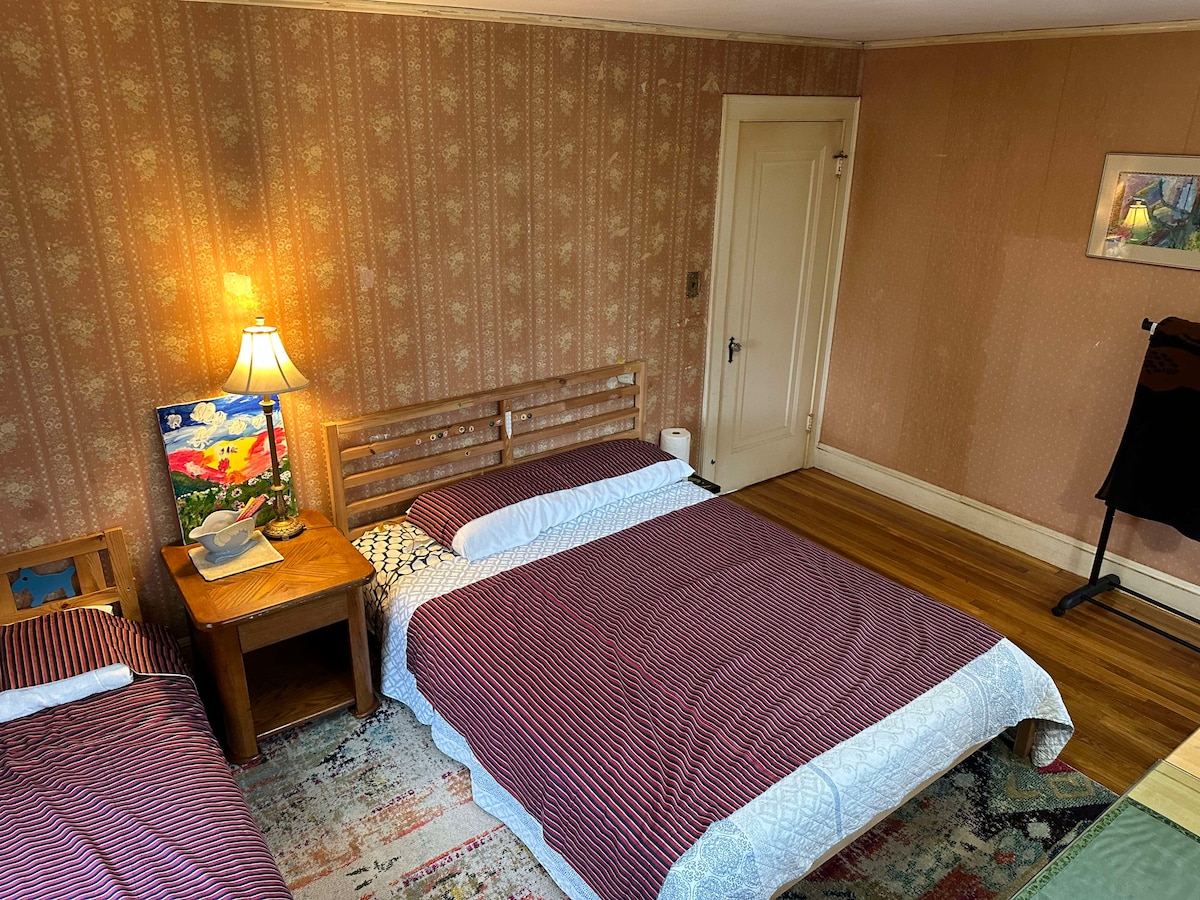 Herbergið er með hjónarúmi og er á þriðju hæð, notalegt og hljóðlátt, innan um trjátoppana. Á kvöldin eru stjörnurnar og á daginn er herbergið létt og sólríkt á kvöldin. Herbergið er með gömlum furuborðsgólfi, loftljósi með skyggni sem dimmir herbergið, loftkælingu, fataskáp, kommóðu, stórt skrifborð með skrifstofuvörum, jógamottu, spegil í fullri lengd og viftu. Þetta svefnherbergi er með fullbúnu baðherbergi með hinu svefnherberginu á þriðju hæð sem er einnig leigt út í gegnum Airbnb. Bílastæði eru í boði fyrir 10 Bandaríkjadali á nótt.