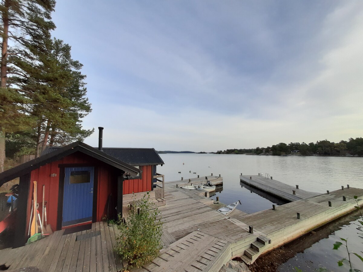 Þetta hús er rétt við vatnsbrúnina. 63 fermetrar. Mjög rólegt, fullkomið fyrir rómantíska helgi. Kveiktu opinn eld, farðu í bað í heita pottinum við hliðina á húsinu, hlustaðu á öldurnar og drekktu vín. Sólsetursveitingastaðir. Kafa í Eystrasalti frá bryggjunni eftir heita pottinn. Horfðu á ferjurnar og snekkjurnar fara framhjá. Nálægt slalompist í Stokkhólmi. 20 mínútur til Stokkhólmsborgar með bíl, eða taka rútu eða ferju. Eða farðu í skoðunarferð í eyjaklasanum. 1 tvöfaldur kajak og 2 einbreiðir kajakar eru innifaldir.