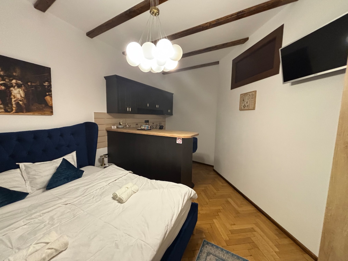 Liniște, echilibru și un design inspirat de prospețimea naturii – bine ați venit în Royal Green. Acest studio a fost creat ca o oază de calm în inima vibrantă a Brașovului. Nuanțele profunde de verde smarald, combinate cu elemente moderne și texturi catifelate, creează un spațiu revitalizant, perfect pentru călătorii care caută relaxare într-un decor boutique sofisticat.