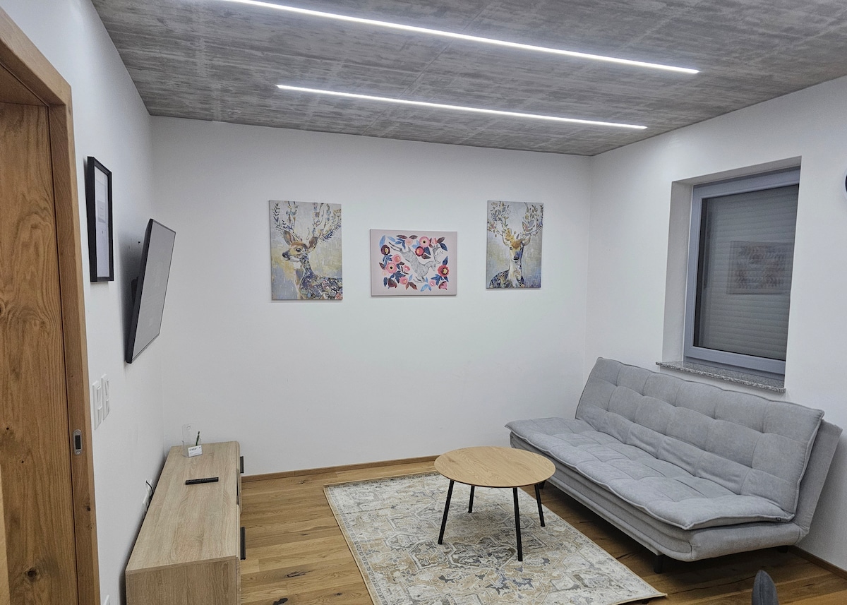 Moderne, ruhig gelegene 2-Zimmer-Wohnung in Mattighofen mit kleinem Eigengarten, eigenem Zugang und eigenem Parkplatz. Geeignet für Paare, Geschäftsreisende und Familien mit Kindern. Es stehen zwei Kinderbetten sowie ein Hochstuhl zur Verfügung. Das Zentrum ist in ca. 790 m erreichbar. Helle, funktionale Raumaufteilung, selbstständiger Check-in möglich. Die Wohnung hat einen Doppelbett, Ein Einzelbett, Schalfsofa & Babybett
