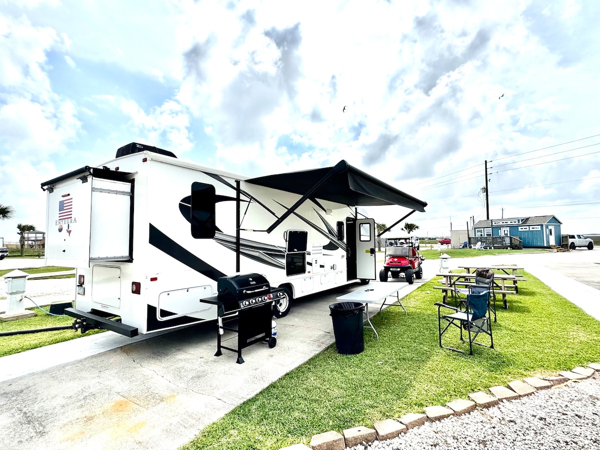 Gistu í húsbíl sem er tengdur við strandlúxusgististaðinn okkar með einkaaðgangi að ströndinni *EÐA* við getum lagt hann beint á ströndina fyrir þig - þitt val. Cold AC, 2 hægindastólar, 3 sjónvörp, öryggismyndavélar að utan og rafknúinn arinn innandyra. Eldhús: tvöfaldir vaskar, ísskápur/frystir, eldavél og ofn, örbylgjuofn. Full size bed in bedroom, Table becomes a twin bed, over cab-a full bed. Rúmföt, handklæði, strandstólar. Einnig eru í boði golfvagnar, brimbretti og ölduhlauparar til leigu. Skilríkisauðkenning er áskilin fyrir innritun