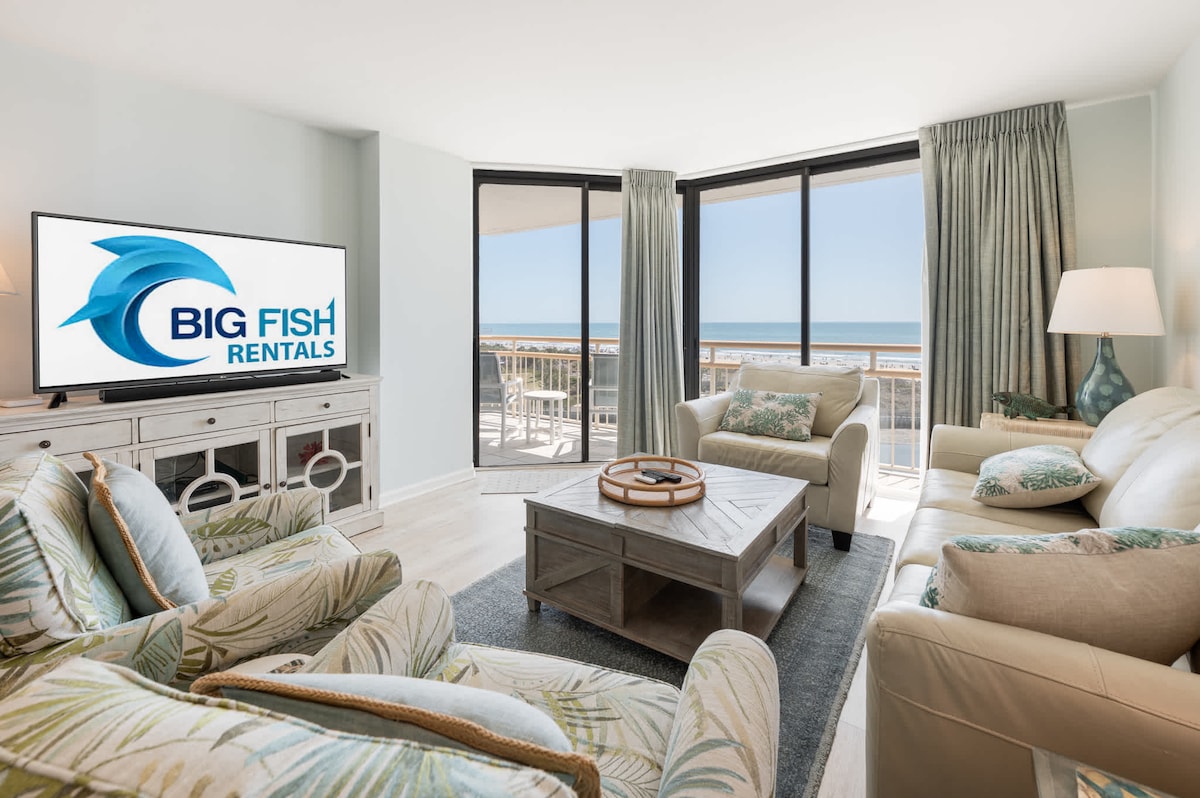 Leita ekki meira... við höfum það allt! Njóttu þessa glæsilega, sjávarútsýnis, nýuppgerða heimilis með kokkaeldhúsi, koddaverum fyrir hótel og hágæða áferðum! Njóttu sólarupprásarinnar á svölunum með sjávarútsýni með útisófa, borði og stólum. Þægindi dvalarstaðarins eru meðal annars afskekkt strönd, sundlaugar og margt fleira. Og kirsuberið á toppnum... þú ert í göngufæri frá hinu fræga Barefoot Landing-afþreyingarhverfi Myrtle Beach!