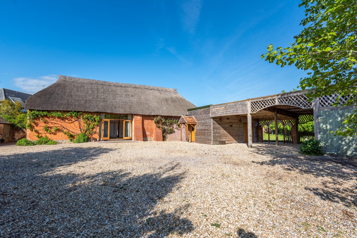 A rural bolthole in a converted barn - comfort and style with just a nod to luxury. Part of a small cluster of outbuildings behind our home, surrounded by 14 acres of fields. Designed for year round use with lovely outside spaces for summer and a cosy interior and wood-burning stove for colder months. Totally self-contained, secluded, and away from the coastal crowds, but just 10 mins Bridport & beach. Attention to every detail to give you everything you want, but nothing you don't need.