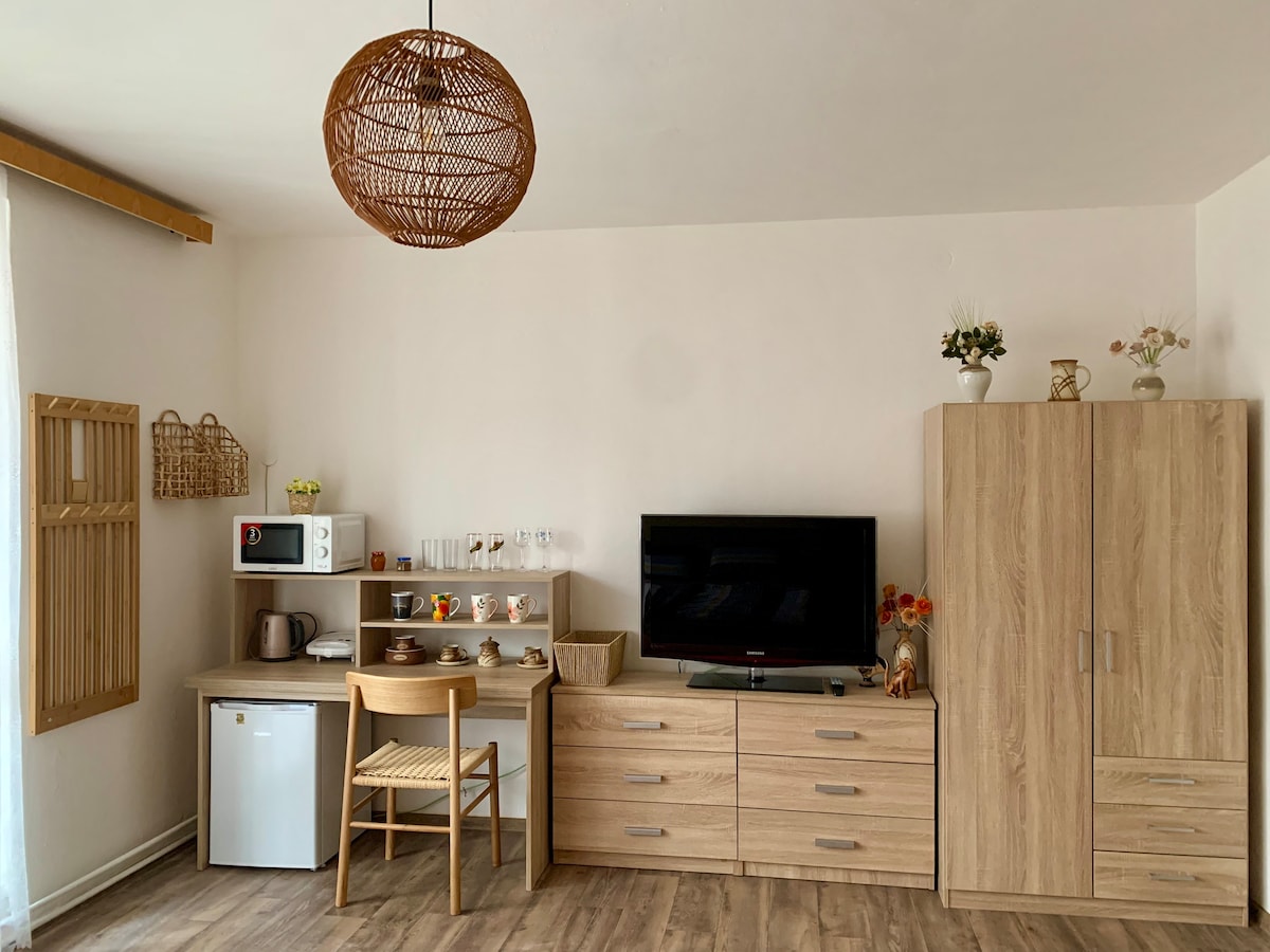 Í þessari sólríku íbúð með garði að framan getur öll fjölskyldan slakað á eða fundið ró og næði. Það er staðsett í rólegum hluta Pasohlávky, nálægt Aqualand Moravia og Novomlýnské nádrže. Það býður upp á fullbúið eldhús, loftræstingu, sérinngang og notalegt setusvæði á veröndinni. Tilvalið fyrir afslöppun og frí.