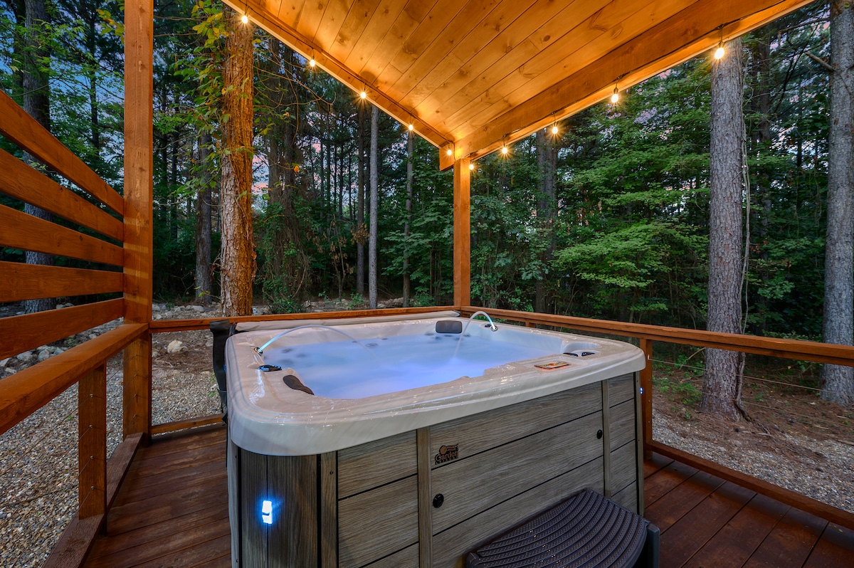 Skrifað í Stars Luxury Cabin er hinn fullkomni rómantískur parakofi! 🏠 🤩 Magnað útsýni! Lúxusskáli 30' upp á trjátoppunum. 💦 15' WOW walk-in shower plus a clawfoot tub. 🧑🍳 Hönnunareldhús með gaseldavél, eyju og hágæða tækjum. 📺 Snjallsjónvörp inni og á umlykjandi verönd með arni utandyra. 🔥 Heitur pottur með LED ljósum og fossi til afslöppunar. 😴 Rúmar allt að fjóra gesti sem hentar vel pari eða lítilli fjölskyldu. 🚫 🐶 Því miður eru engin gæludýr leyfð