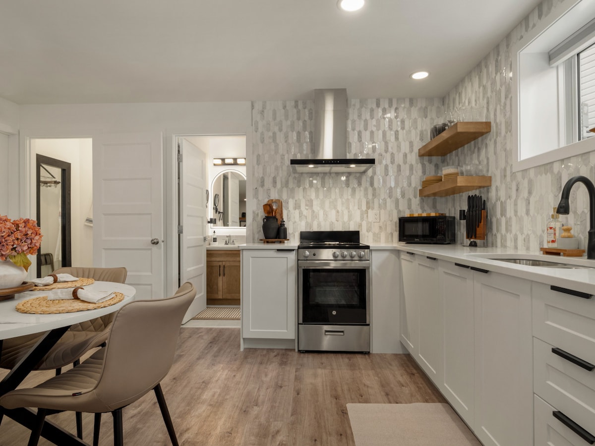 Njóttu nútímalegrar upplifunar í þessari nýuppgerðu kjallarasvítu. Fullbúið eldhús með tækjum í íbúð, kaffibar og vatnssíun. Tvö þægileg queen-rúm, rúmgóð stofa með sjónvarps- og efnisveitu og þriggja manna baðherbergi með regnsturtu. Aðgangur að sameiginlegu útisvæði með grilli, eldgryfju og sætum utandyra. Skref í burtu frá sögulega miðbænum og vann stolt með PoolHouse Coffee Roastery til að færa þér ferskasta kaffi í bænum.