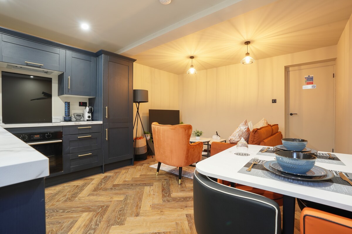 Slappaðu af í stílhreinu okkar, Ecclesall Road, tveggja herbergja íbúð. Íbúðin hefur allt sem þú þarft til að slaka á og slaka á meðan á dvölinni stendur. Með setustofunni sem býður upp á 75"veggfest 4k sjónvarp á nútímalegum slatwall bakgrunni, borðstofuborð með stemningu. Bæði svefnherbergin bjóða upp á king size rúm með Simba memory form dýnum. Eldhúsið er með sambyggðum tækjum með kaffivél með ókeypis hylkjum. Baðherbergið er með stóra sturtu með nútímalegum svörtum eiginleikum