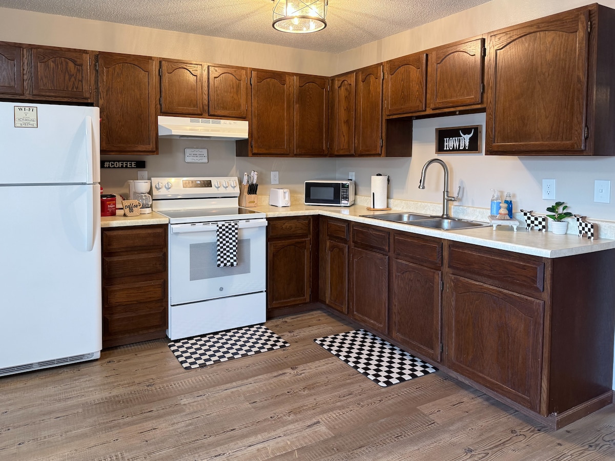 Slakaðu á með allri fjölskyldunni eða veiðifélögum þínum á þessum friðsæla gististað rétt fyrir utan bæinn. 5 svefnherbergi og 2,5 baðherbergi. Á efri hæðinni eru 3 svefnherbergi. Eitt king-rúm, eitt hjónarúm og 2 einstaklingsrúm. Á neðri hæðinni er queen-rúm, 2 mjög löng tvíbreið rúm og svefnsófi. Allir fá stað til að sofa á! Það er með rúmgóðan pall með fallegu útsýni yfir landið. Bakgarðurinn er stór og í honum er afgirt hundahótel utandyra. Gæludýr eru leyfð í bílskúrnum og utandyra.