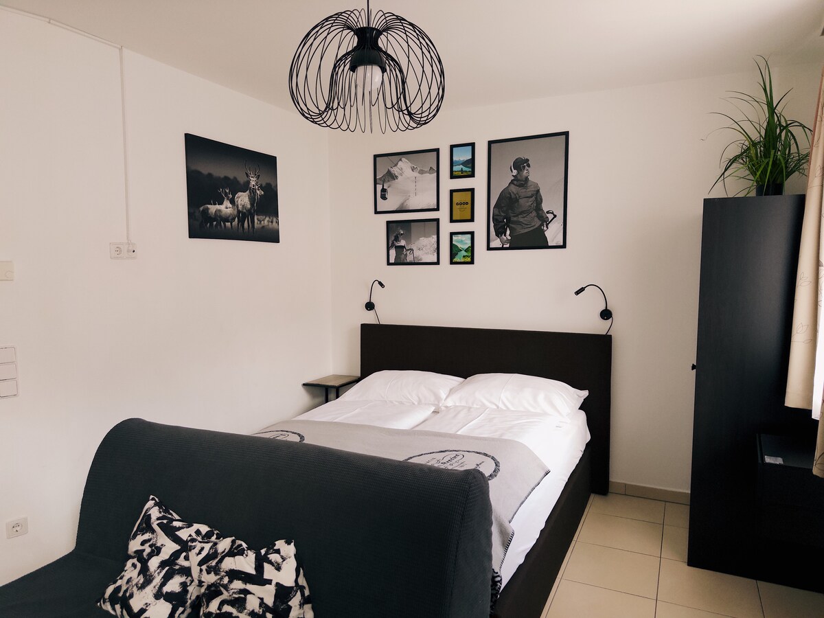 Um það bil 38 m2 íbúðin er staðsett í einbýlishúsinu okkar, á fyrstu hæð. Það samanstendur af svefnherbergi með hjónarúmi, sjónvarpi, svefnsófa, svölum, fataskáp, eldhúskrók, borðstofu, fataskáp og stóru baðherbergi með baðkari og salerni. Þráðlaust net, bílastæði og afnot af skíðakjallaranum eru ókeypis. Við sem gestgjafar þínir búum á jarðhæð. Inngangurinn þinn er að sjálfsögðu aðskilinn.