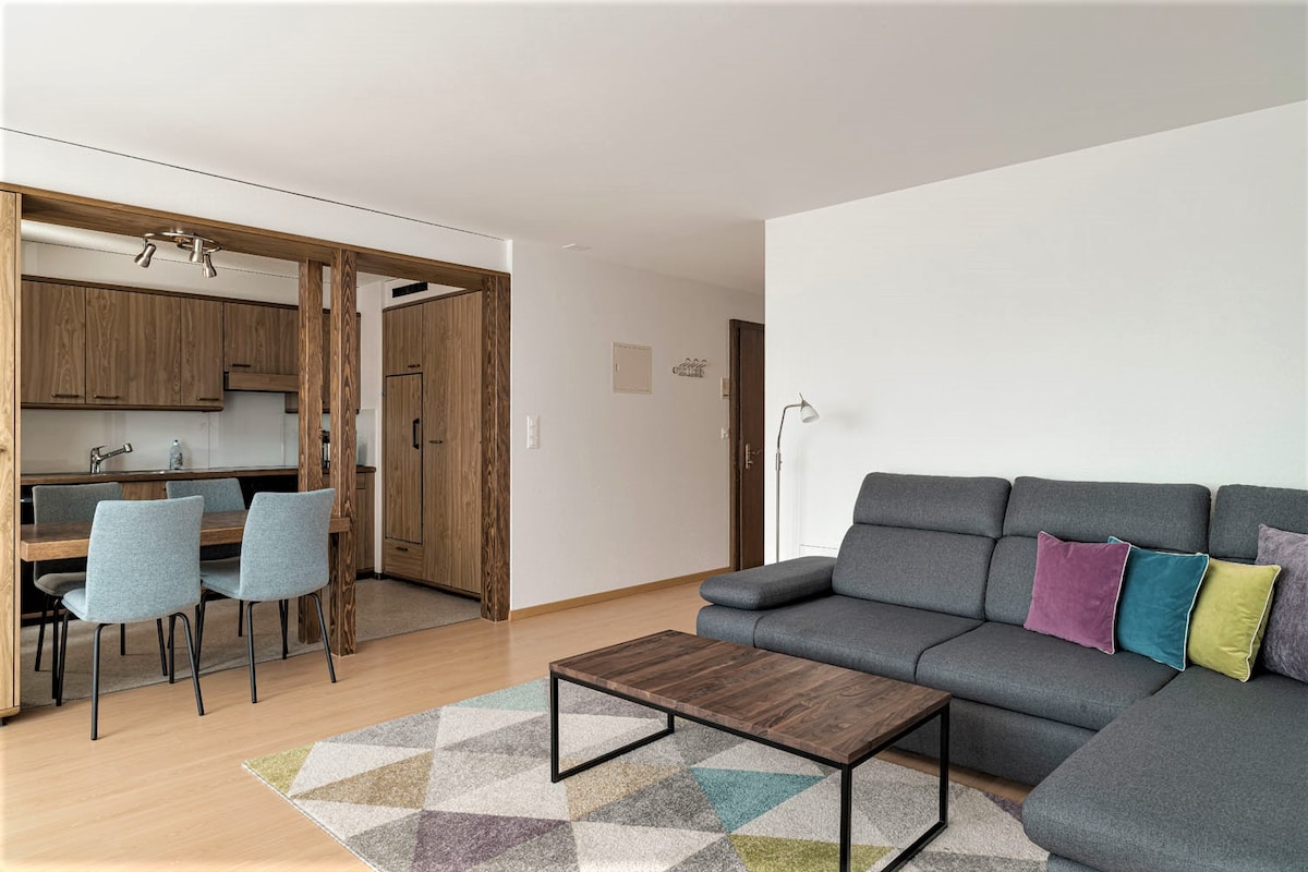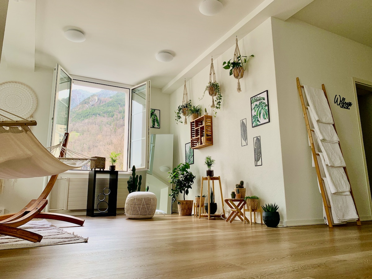 Nútímaleg háaloftsíbúð með útsýni yfir vatnið og í fjöllin, einkasvalir í rólegu hverfi. Íbúðin er í aðeins 5 mínútna göngufjarlægð frá vatninu og skóginum. Tilvalið fyrir þá sem elska staði, brimbretti, sund, gönguferðir, hjólreiðar, skíði. Windurfing stöðin við Lake Urnersee er í 5 mínútna göngufjarlægð. Frábær upphafspunktur til að skoða miðborg Sviss á 30 mínútum með bíl til Lucerne og Ticino. Strætóstoppistöð er í 200 metra fjarlægð og veitingastaðir og barir eru í göngufæri.