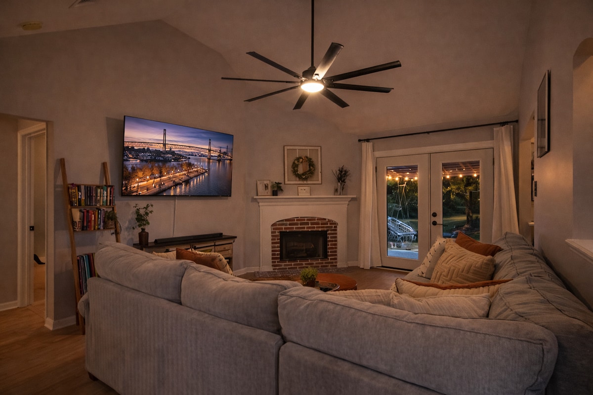 Skemmtu þér með allri fjölskyldunni (meira að segja gæludýrunum) á þessu glæsilega bóhemheimili í úthverfunum. Við erum staðsett í akstursfjarlægð frá ýmsum þægindum, þar á meðal verslun, veitingastöðum, almenningsgörðum og fleiru. Hvort sem þú ert að njóta þín í stofunni við arineldinn eða nýtur golunnar á veröndinni aftan við húsið á meðan þú horfir á börnin leika sér á rólunum eða gæludýrin þín leika sér í bakgarðinum þá vonum við að þér líði vel hérna. Við bættum nýlega við leikhússali og afþreyingarherbergi!
